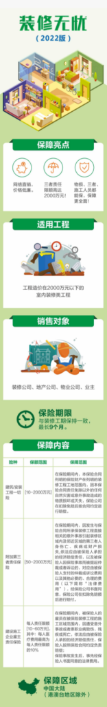 -建筑/安装工程一切险:在保险期间内,本保险合同列明的保险财产在列明的装修工程工地范围内,因本保险合同责任免除以外的任何自然灾害或意外事故造成的物质损坏或灭失,保险公司在扣除免赔后按合同约定进行赔偿。【保额范围:10万-2000万】